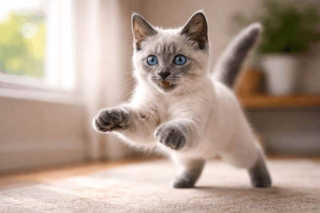 A young blue point Siamese kitten behaves very differently from an adult. Kittens show higher energy, constant curiosity, and rapid kitten color development changes in their coat.
