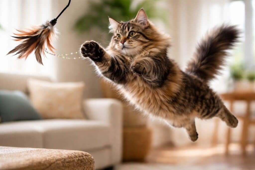 Feather toys and moving wand toys mimic flying prey. When used daily, they replicate insect hunting behavior in cats without exposure to germs. This type of play also promotes physical exercise and mental engagement.