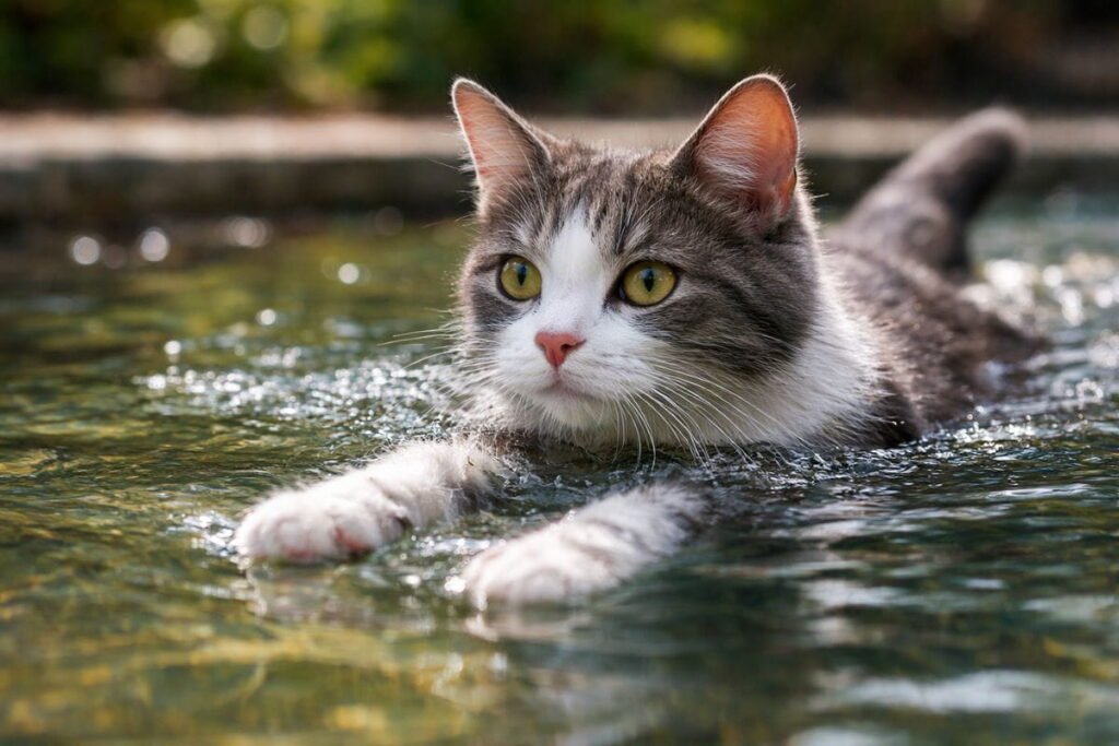 So, can cats swim naturally? In short, yes. Most cats have a survival instinct that activates when they hit water. This triggers a natural paddling reflex supported by their feline body structure, including a flexible spine and powerful hind legs. These features allow brief movement through water.