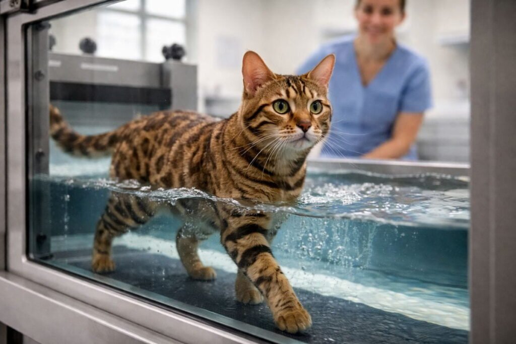 Under strict control, water can support health. Veterinarians sometimes recommend hydrotherapy for cats. It provides low-impact exercise that protects joints. This can improve mobility and deliver gentle joint support.