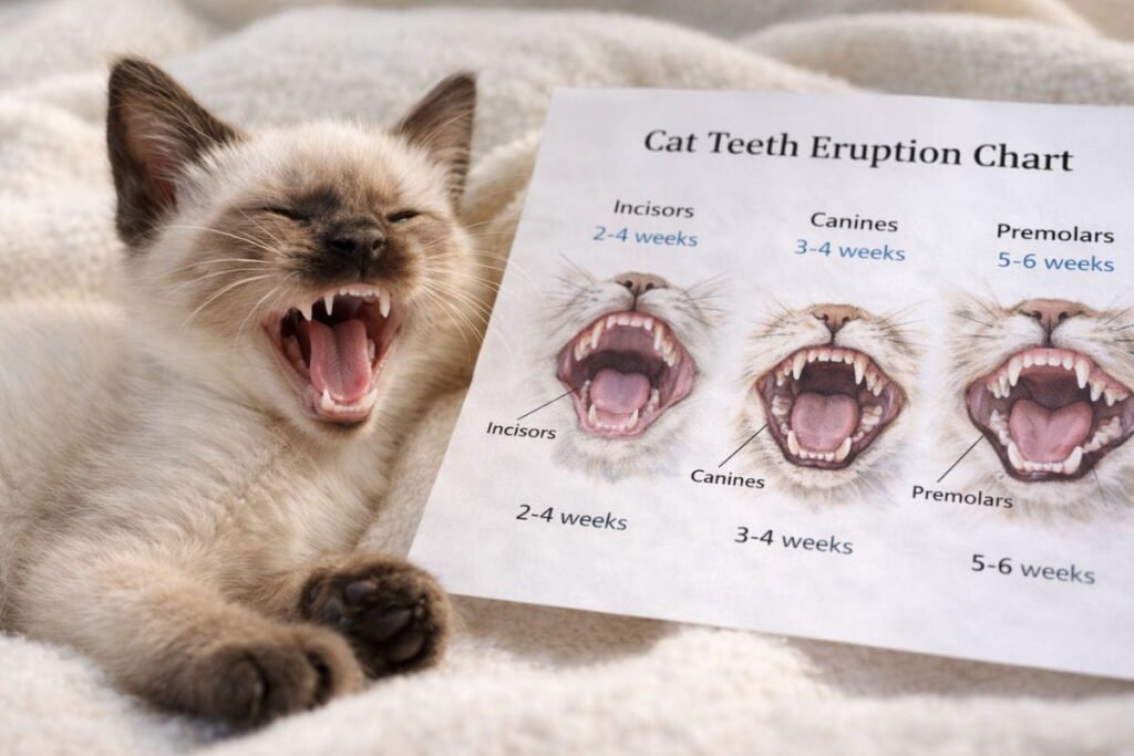 Kittens develop teeth in stages that are easy to follow using a cat teeth eruption chart. The first incisors appear around two to three weeks, followed by canines and premolars. By six months, most kittens have a complete adult set. Tracking this with a kitten dental chart can alert you if teeth are delayed or growing incorrectly.
