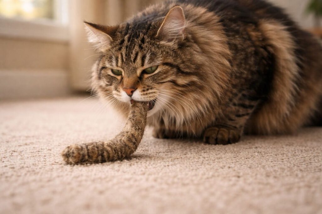If you see tubular hairballs, that confirms long-haired cat vomiting, especially with Maine Coon hairballs or Persian cat hairballs. Foam mixed with coughing sounds may relate to coughing vs gagging, not true vomiting.