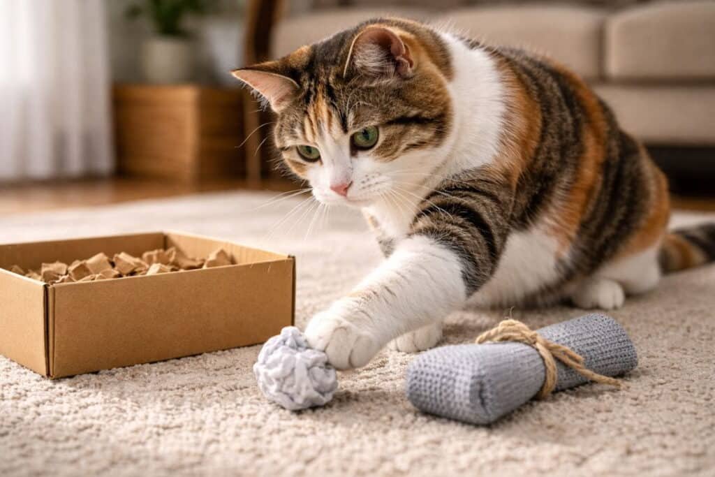 You don’t need expensive toys to keep your senior cat happy. Simple household items can be transformed into engaging toys. Crumpled paper balls, cardboard boxes, or old socks with catnip can act as senior cat play toys. These provide gentle exercise for cats and stimulate curiosity.
