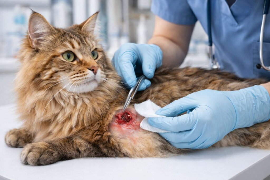 Veterinarians typically perform abscess drainage followed by antibiotic treatment. Without proper care, abscesses can cause deep tissue damage. Early cat wound care prevents repeated infections and painful complications.
