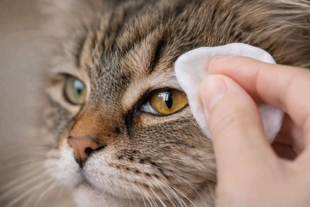 Gentle cleaning helps remove buildup around the eyes. Soft cotton pads and warm water work best for safe cat eye cleaning. Always wipe outward from the corner of the eye.