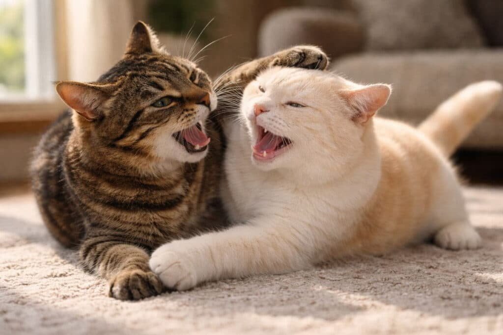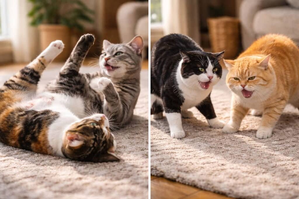 Real conflict shows different signals. Owners may notice cat aggression signs such as hissing, stiff posture, and puffed fur. These warning behaviors indicate tension rather than normal feline play fighting.